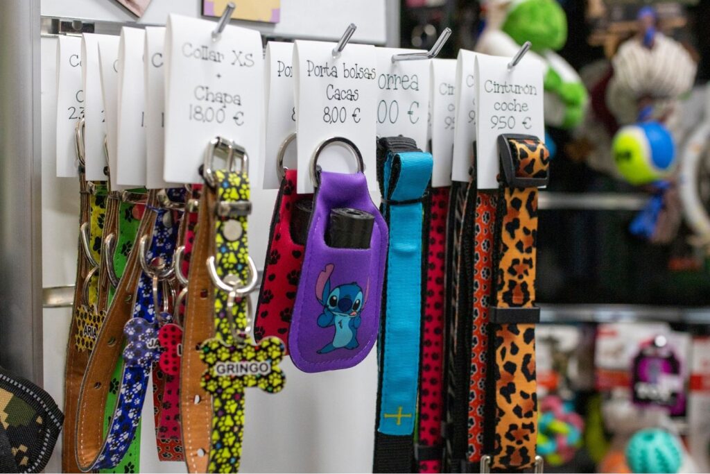 Disponemos de accesorios para mascotas, entre ellos chapas identificativas, arneses y collares personalizados con el nombre de la mascota.